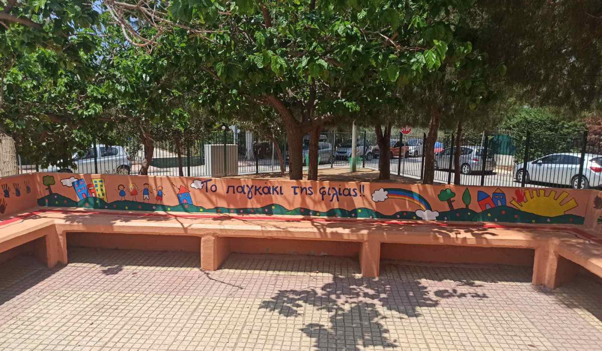 Το παγκάκι το φιλοτέχνησαν τα παιδιά των Α’ και Στ’ τάξεων από κοινού, στα πλαίσια του προγράμματος “υιοθεσίας” των μαθητών της Α’ τάξης από τους μαθητές της Στ’ τάξης.