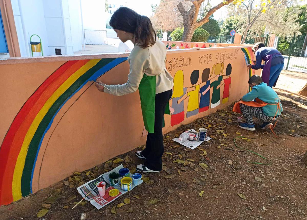 Η διαδικασία ξεκίνησε με μια κοινή δράση των δύο τάξεων, όπου οι μεγαλύτεροι μαθητές και μαθήτριες βοήθησαν τα «πρωτάκια» τους να αφήσουν το αποτύπωμα της παλάμης τους στο παγκάκι και συνεχίστηκε με τα παιδιά της Στ’ τάξης να ολοκληρώνουν τις τοιχογραφίες στις δυο όψεις.